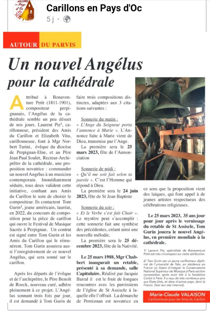 Les carillonneurs de la cathédrale – qui donnent chaque samedi à 11h un concert avec l’angélus de la cathédrale de Perpignan – et les amis du Carillon – organisateurs d’un festival international du carillon depuis 22 ans et à l’origine de l’installation d’une cloche civile appelée cloche de la Paix, ont uni leurs forces pour créer un nouvel angélus.