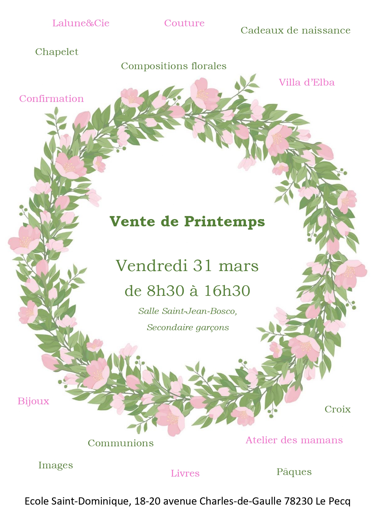 En vue des cérémonies religieuses de printemps, de Pâques, de la fête des mères et des pères, des mariages, l’Ecole saint-Dominique vous propose une vente spéciale le vendredi 31 mars de 8h30 à 16h30. Nombreux stands : Librairie, bijoux, objets religieux, image pieuses, Villa d’Elba, décorations florales, créations des mamans, cadeaux de naissance.