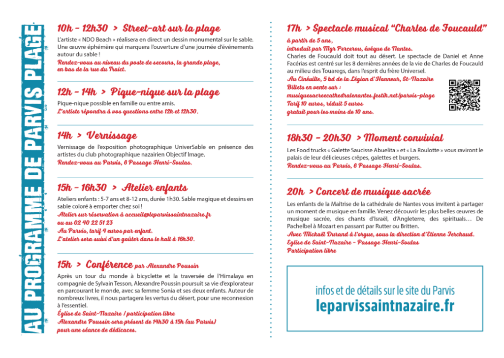 À l’occasion du vernissage de la nouvelle exposition au Parvis, la journée s’articulera autour du thème du sable : sensible et poétique, chargé de symboles et de spiritualité, de la plage au Parvis de Saint-Nazaire, le sable fera voyager les participants. Exposition, ateliers, concert, spectacle, moments conviviaux, sont au programme – moins pire qu’on pourrait le craindre, puisqu’un spectacle musical sur saint Charles de Foucauld est au programme (17h) ainsi qu’un concert de musique sacrée par la maîtrise de la cathédrale de Nantes à l’église de Saint-Nazaire centre.