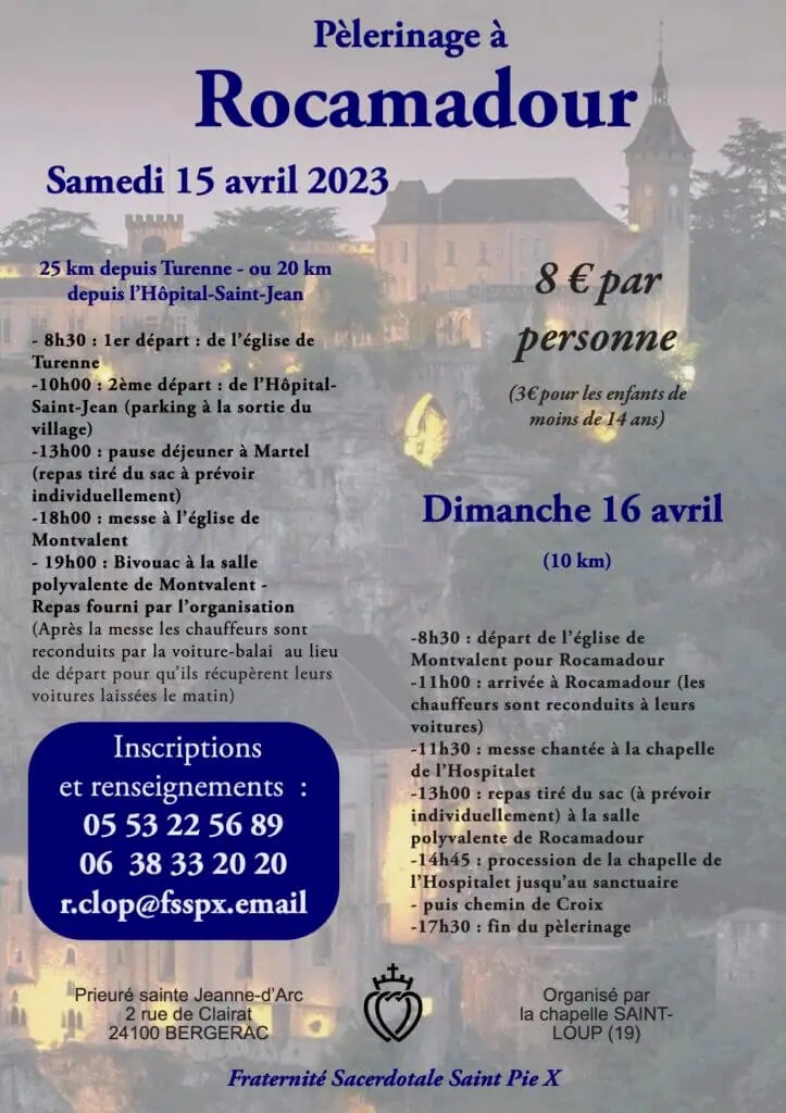 Accueil » Nos archives » Pèlerinage vers Rocamadour (FSSPX) les 15 et 16 avril Informations Pèlerinage vers Rocamadour (FSSPX) les 15 et 16 avril La Chapelle Saint-Loup de Saint-Clément (15 km au nord ouest de Tulle) organise un pèlerinage de Turenne (19) à Rocamadour (46) les samedi 15 et dimanche 16 avril Renseignements La Porte Latine Article précédentMgr Ulrich marche sur des œufs… de Pâques Article suivantPerpignan : nouvel angélus à la cathédrale 9 avril 2023