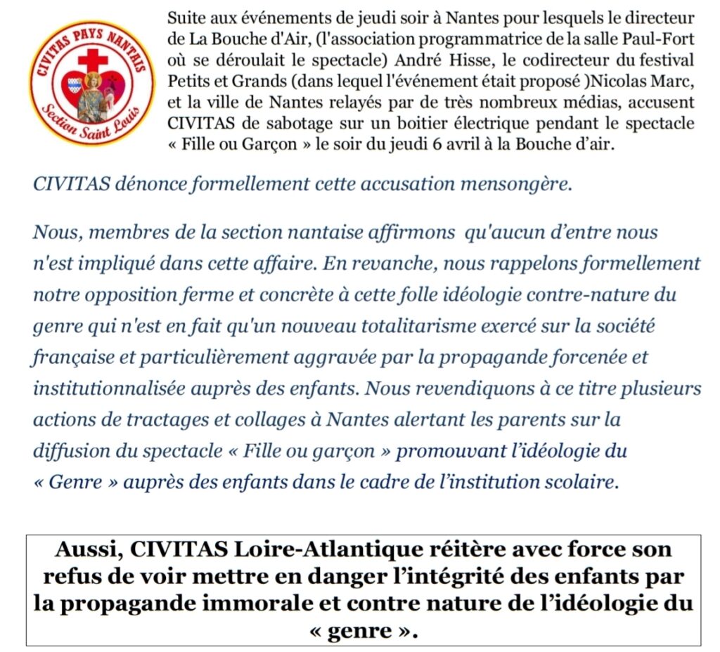 Après une panne électrique lors d’un spectacle LGBT salle Paul Fort quartier Viarme-Talensac à Nantes, le 6 avril dernier, la ville et les organisateurs ont accusé Civitas de sabotage, un homme – qui n’est pas un militant de Civitas – ayant été interpellé près d’un tableau electrique.