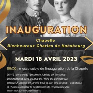 Accueil » Nos archives » Saint-Roch (Paris): Inauguration de la chapelle du Bienheureux Charles de Habsbourg Informations Saint-Roch (Paris): Inauguration de la chapelle du Bienheureux Charles de Habsbourg L’église paroissiale Saint-Roch (Paris 1er) inaugure dans quelques jours une chapelle Bienheureux Charles d’Autriche le mardi 18 avril : Eglise Saint-Roch (Paris) Article précédentRéorganisation du diocèse de Bayeux-Lisieux Article suivantAjoux (07) : la mairie rénove l'église pour qu'elle serve enfin 11 avril 2023