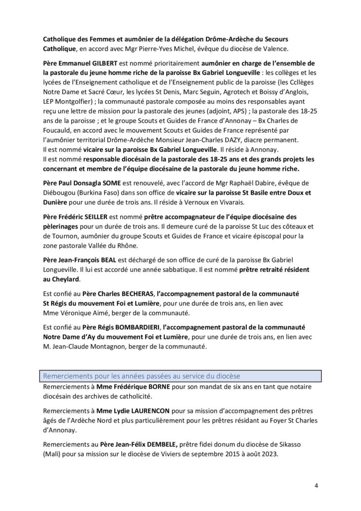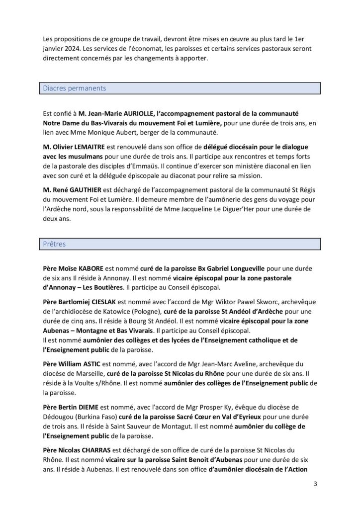 On note parmi elles l’arrivée d’un prêtre polonais du diocèse de Katowice à Bourg-saint-Andéol, le transfert d’un prêtre marseillais mis à disposition du diocèse de Viviers depuis 2018, William Astic, à la Voulte… le curé d’Annonay, Jean-François Béal, par en année sabbatique… mais pas très loin puisqu’il reste résident au Cheylard. Deux prêtres issus du diocèse de Sikasso (Mali) et Debougou (Burkina) quittent le diocèse.