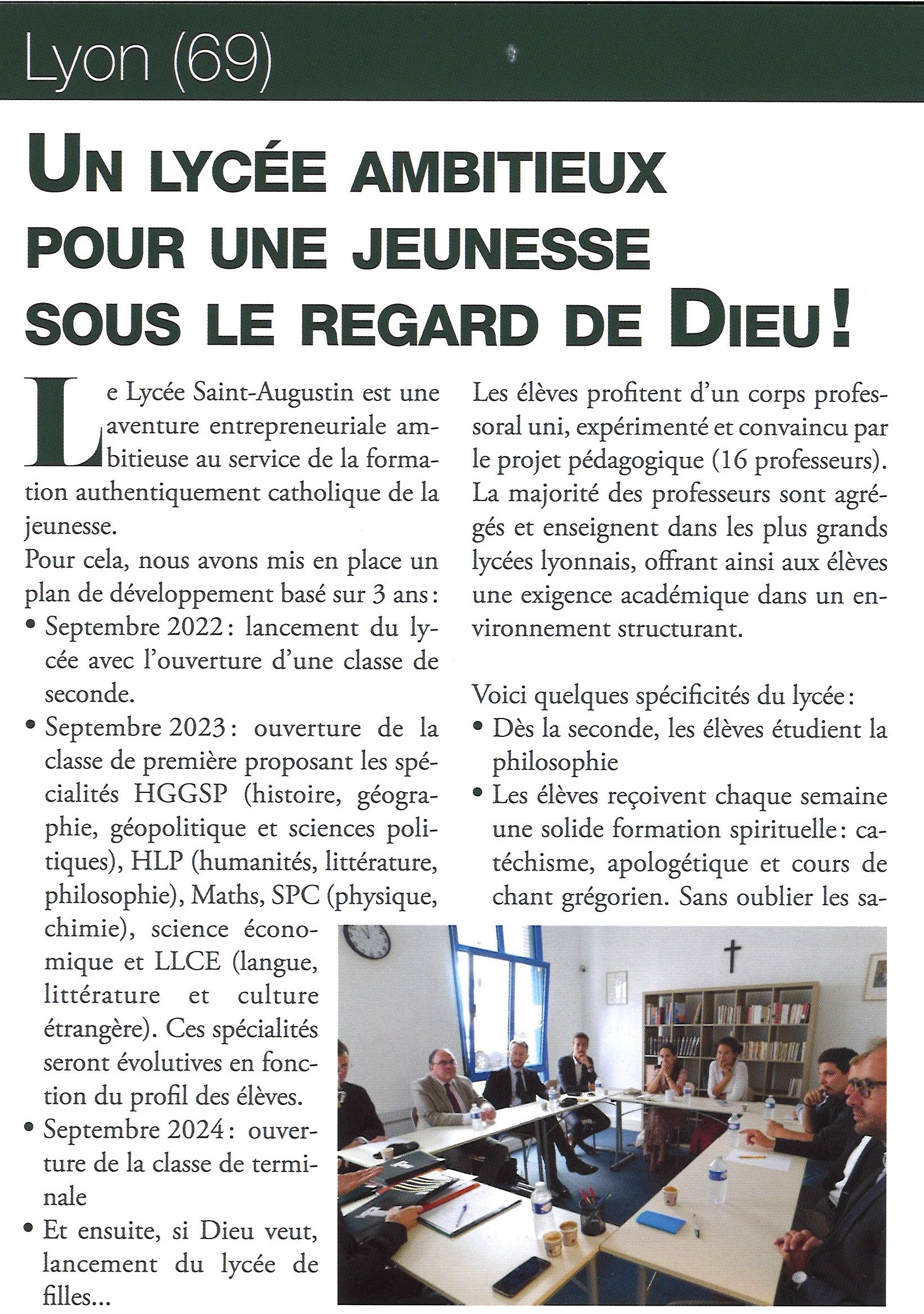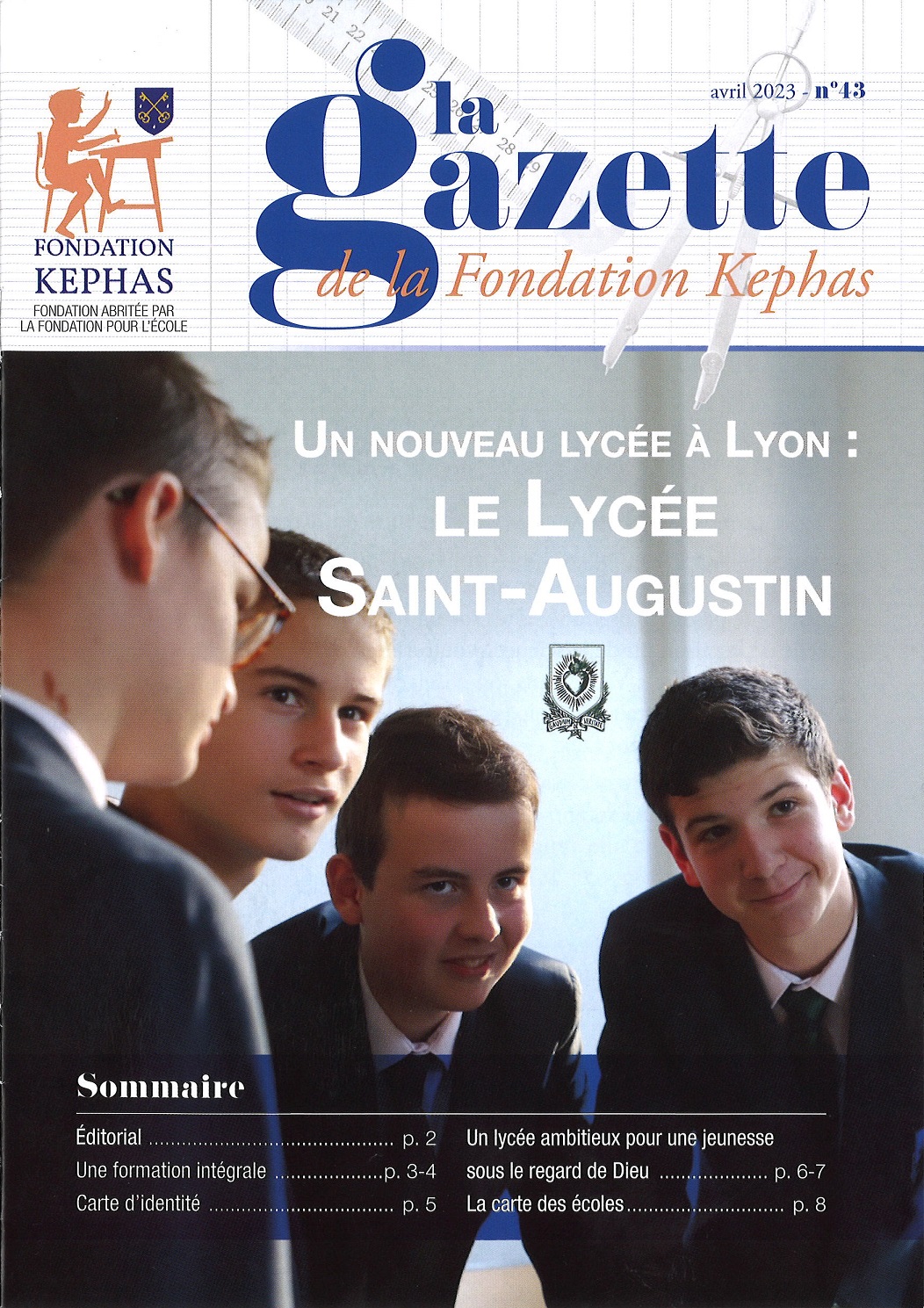 Dans le dernier numéro de sa Gazette (n°43, Avril 2023), la Fondation Kephas revient sur l’ouverture du lycée Saint-Augustin à Lyon, lycée indépendant qui a ouverte ses portes en septembre 2022.