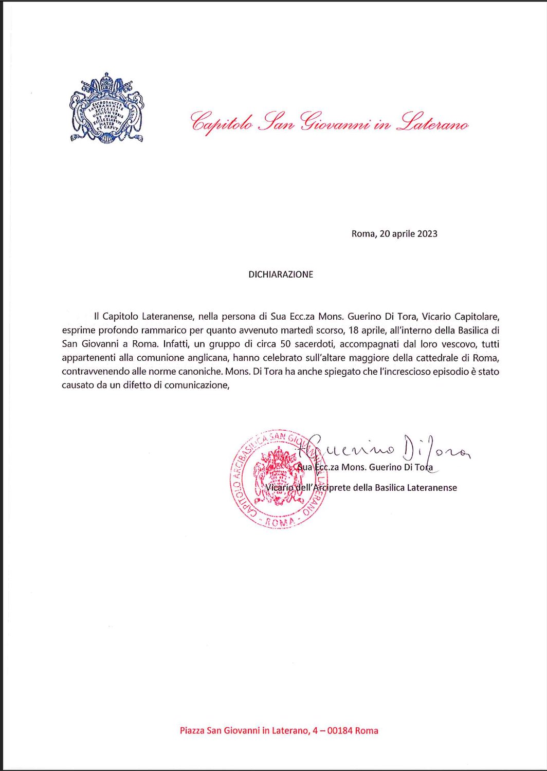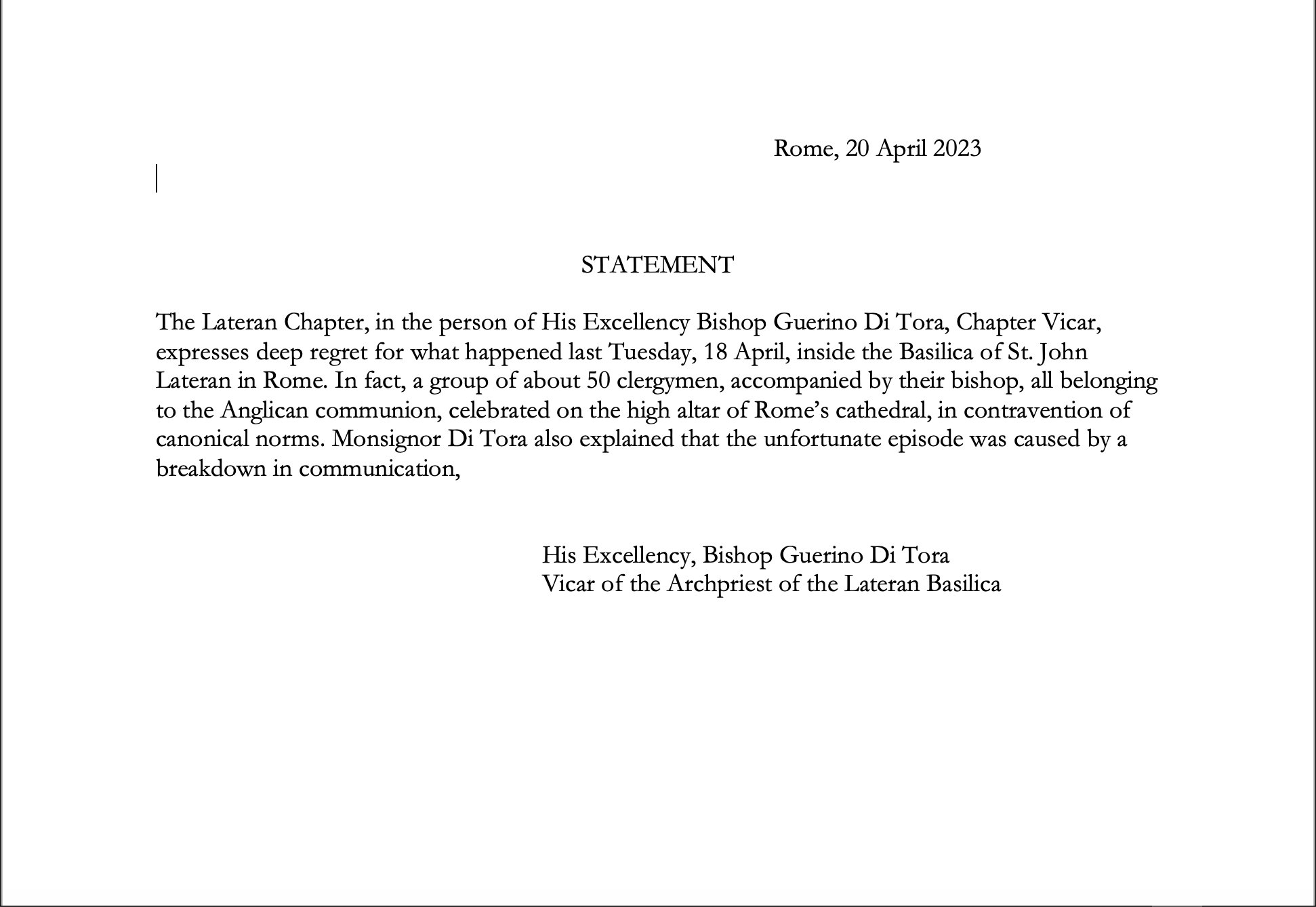 Le Vatican par reconnaître le caractère irrégulier de cette célébration. Dans un communiqué daté d’aujourd’hui, le chapitre de Saint-Jean de Latran, par la voix de son vicaire capitulaire Mgr Guerino di Tora, a exprimé son « profond regret ». Il indique qu’«un groupe d’environ 50 prêtres, accompagnés de leur évêque, tous appartenant à la Communion anglicane, ont célébré sur le maître-autel de la cathédrale de Rome en violation des normes canoniques ».