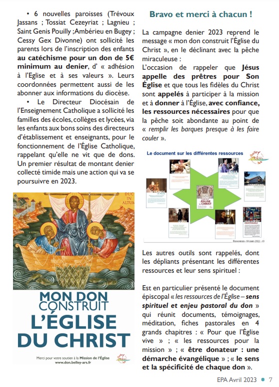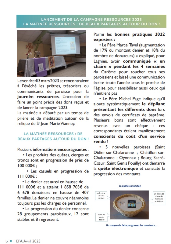 Par ailleurs, certaines pratiques interrogent : « 6 nouvelles paroisses (Trévoux Jassans ; Tossiat Cezeyriat ; Lagnieu ; Saint Genis Pouilly ; Ambérieu en Bugey ; Cessy Gex Divonne) ont sollicité les parents lors de l’inscription des enfants au catéchisme pour un don de 5€ minimum au denier, d’ « adhésion à l’Eglise et à ses valeurs ». Leurs coordonnées permettent aussi de les abonner aux informations du diocèse« .