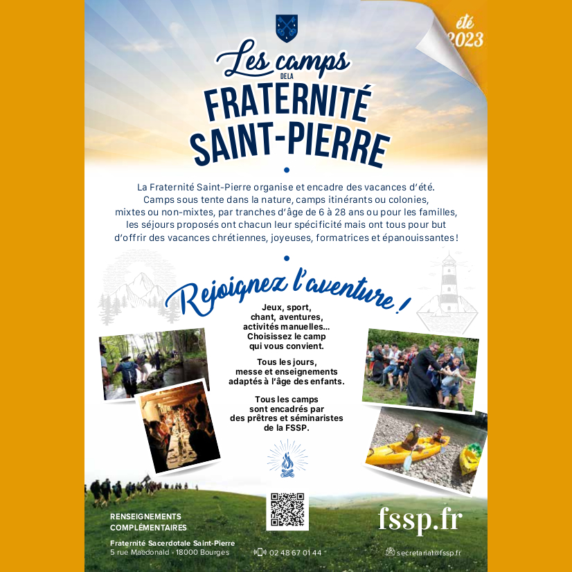 Accueil » Nos archives » Camps et colonies de la Fraternité Saint-Pierre Summorum Pontificum Camps et colonies de la Fraternité Saint-Pierre Il reste quelques places ! Retrouvez tous les camps et les liens pour les inscriptions sur https://www.fssp.fr/oeuvres-et-activites/camps-et-colonies/ Article précédentClub des hommes en noir : Comment vont les prêtres de France ? Article suivantDimanche du Bon Pasteur 22 avril 2023