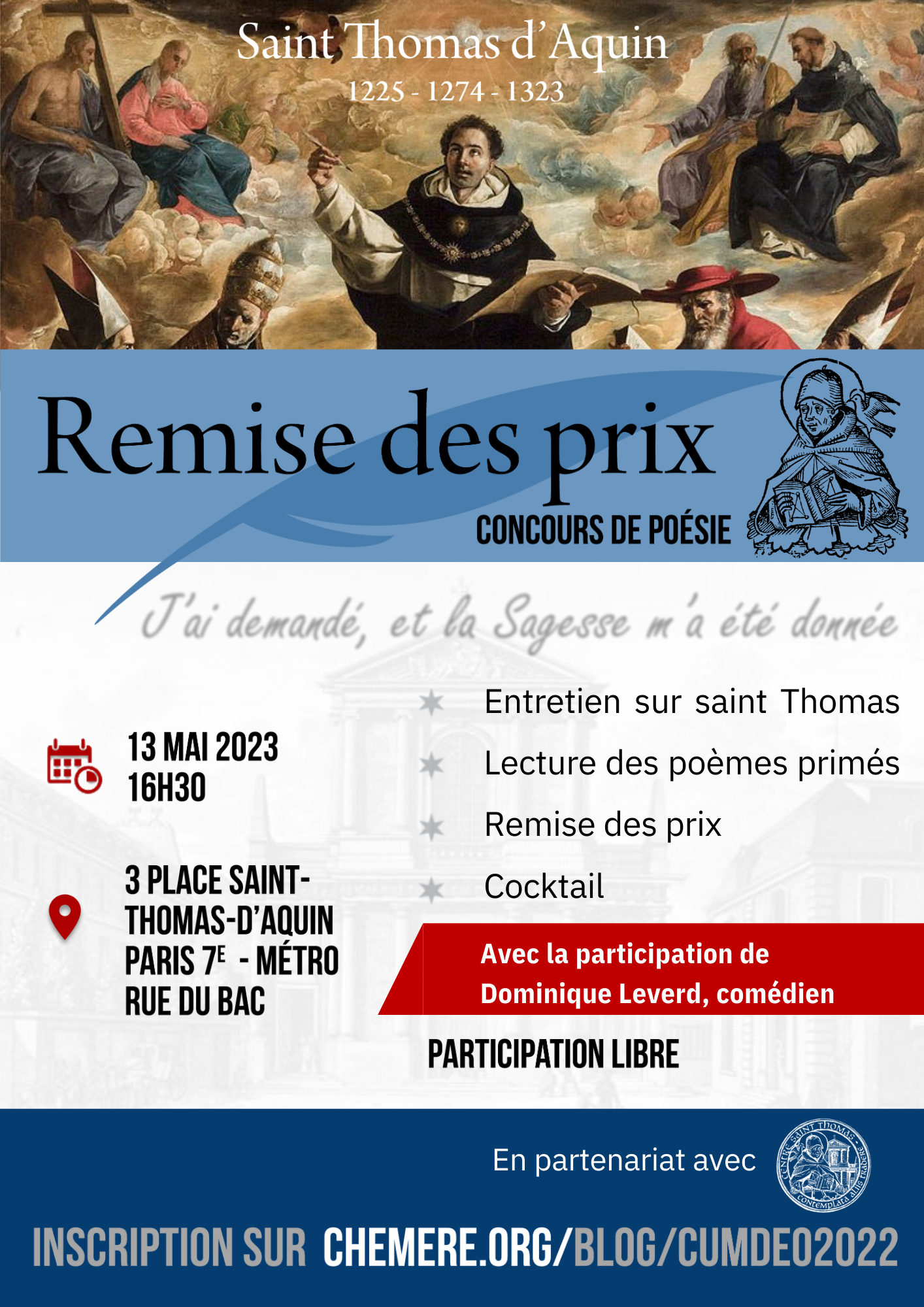 Au programme : entretien sur saint Thomas, lecture des poèmes et remise des prix. À noter : intervention de M. Dominique Leverd, comédien et fondateur du cours Verbe et Lumière.