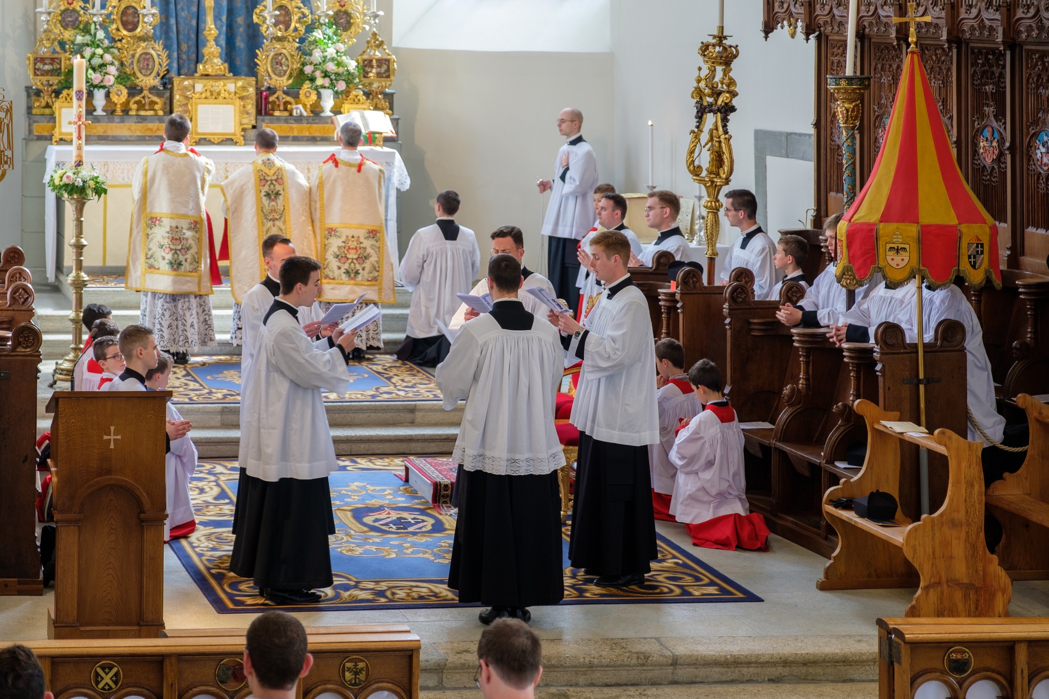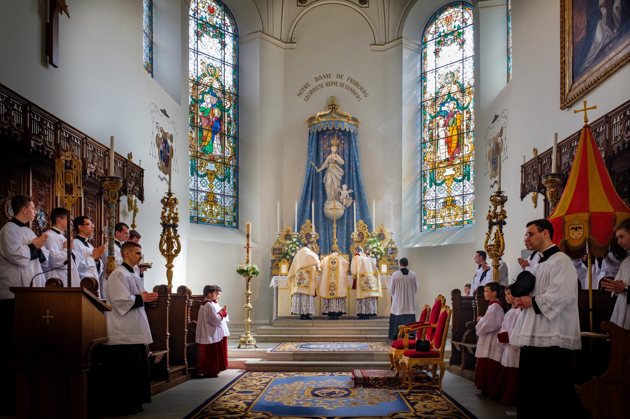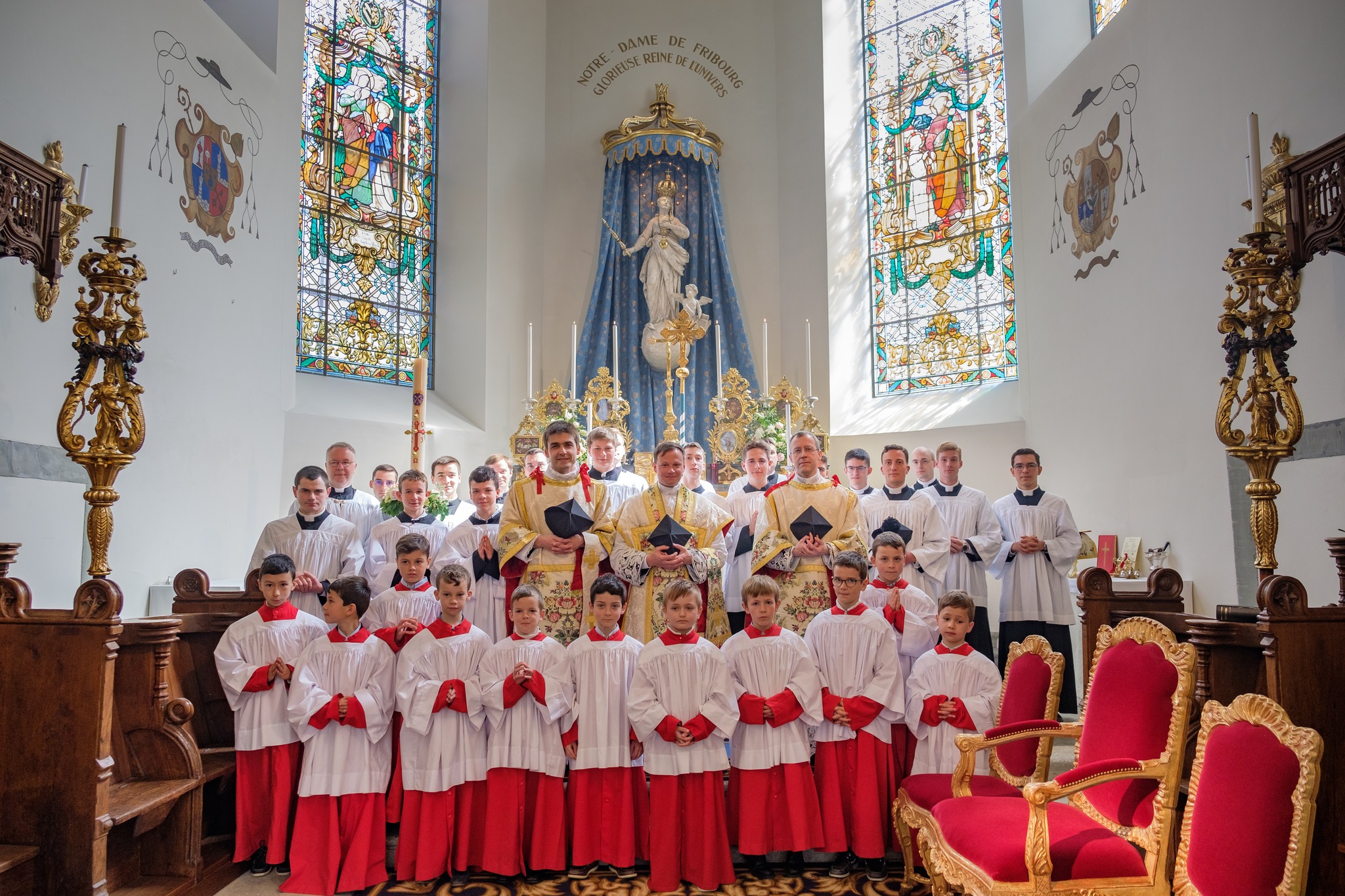 Pour le 2ème dimanche après Pâques, dit du Bon Pasteur, une partie des séminaristes francophones du Séminaire Saint-Pierre de Wigratzbad étaient Fribourg (Suisse), siège de la Maison Générale de la Fraternité Saint-Pierre (FSSP). Ils ont chanté la messe en la Basilique Notre-Dame, magnifiquement restaurée de 1990 à 2010 et dont la Fraternité Saint-Pierre a la charge depuis 2012.