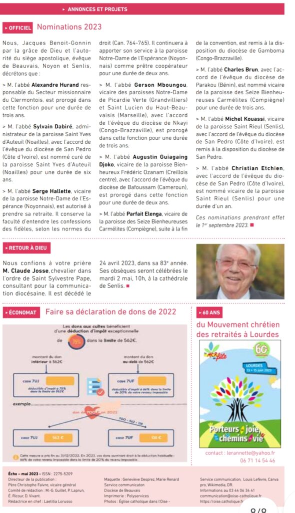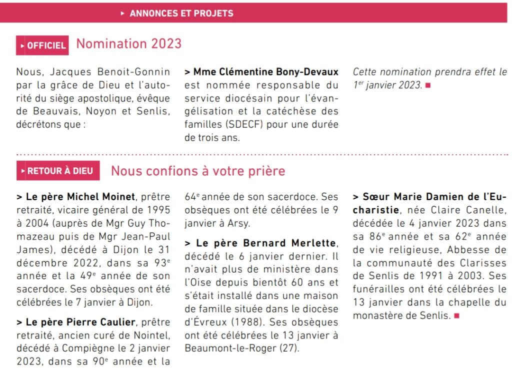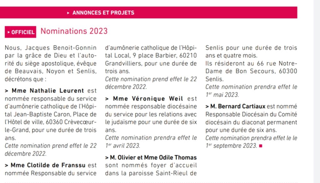 Dans la revue diocésaine du mois de mai Mgr Benoit-Gonnin a rendu publiques des nominations pour septembre prochain.