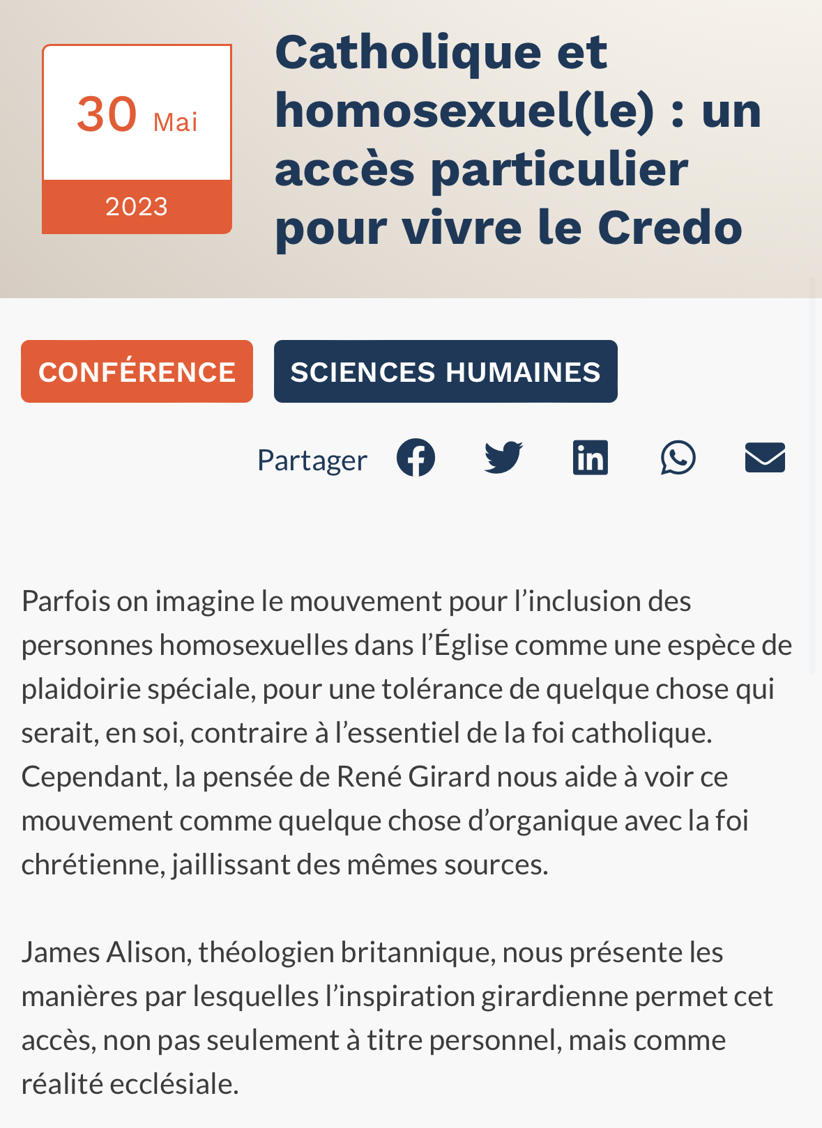 Juste avant notre formation le 3 juin sur #Bible et #homosexualité à La Barouillère (Paris 6), le Centre Sèvres vous propose une soirée le 30 mai avec @JamesAlison11. @davbellamy @D_et_J @CChaland @MDumont75 @egabriot @pclanche. On s'inscrit aux 2 !https://t.co/uNclE2GSWB