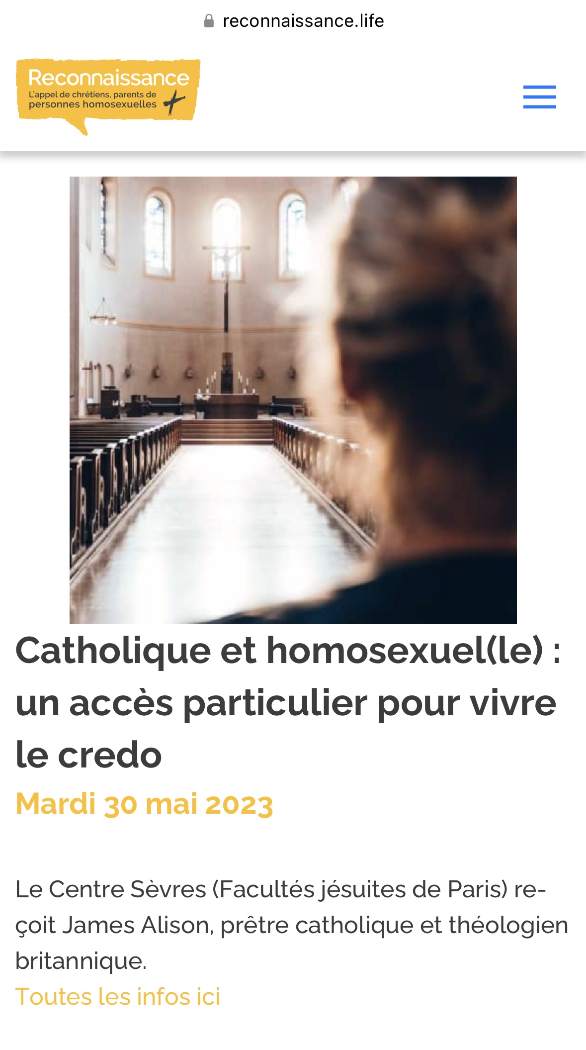 Il serait spécialiste de René Girard et aurait réfléchi à la question du désir mimétique: James Alison sera reçu par le Centre Sèvres le mardi 30 mai prochain. Si l’on en croit le site de cet institut, « James Alison, théologien britannique, nous présente les manières par lesquelles l’inspiration girardienne permet cet accès, non pas seulement à titre personnel, mais comme réalité ecclésiale. ». Mais l’invité est présenté comme un prêtre par l’association « Reconnaissance » qui milite pour l’acceptation de l’homosexualité dans l’Église. Dans sa page d’accueil, cette association indique entend témoigner « de l’accueil de l’homosexualité au sein des « églises domestiques » que sont nos familles ». Dans sa présentation, l’association estime « que l’homosexualité peut et doit être accueillie dans les familles et dans l’Église catholique comme une variante naturelle et non choisie de l’amour humain » (précision: la partie de la phrase en gras l’est aussi sur le site). La conférence a comme intitulé « un accès particulier pour vivre le credo ».