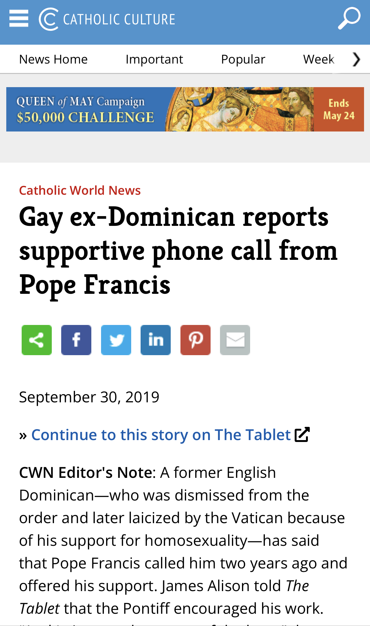 Mais on apprend, selon le site Catholic World News, que James Alison aurait été auparavant renvoyé de l’ordre dominicain et réduit à l’état laïc. Son engagement et son implication dans ce sujet en seraient la cause. D’après la page Wikipedia, « Alison croit que l’enseignement de l’Église catholique sur l’’homosexualité jusqu’à présent a été anormal car il repose sur une prémisse fondamentalement erronée de l’hétérosexualité intrinsèque présumée de tous les humains (en d’autres termes, les homosexuels étant simplement des hétérosexuels défectueux) ».