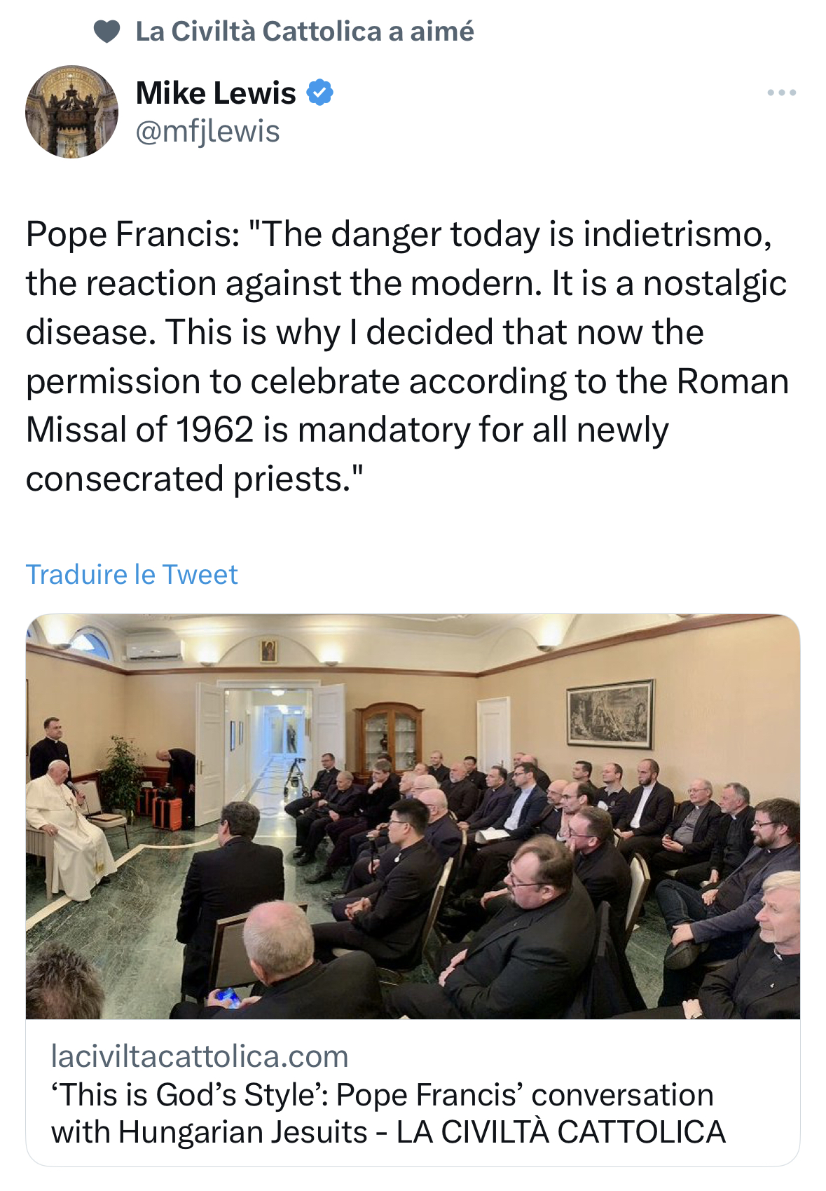 Le Pape évoque le Commonitorium de Saint Vincent de Lérins et dénonce le « danger de de l’indiestrismo, la réaction contre le moderne. C’est une maladie nostalgique. C’est pourquoi j’ai décidé que maintenant la permission de célébrer selon le Missel Romain de 1962 est obligatoire pour tous les prêtres nouvellement consacrés. Après toutes les consultations nécessaires, j’ai décidé cela parce que j’ai vu que les bonnes mesures pastorales mises en place par Jean-Paul II et Benoît XVI étaient utilisées de manière idéologique, pour revenir en arrière. Il fallait arrêter cet indietrismo, qui n’était pas dans la vision pastorale de mes prédécesseurs. »