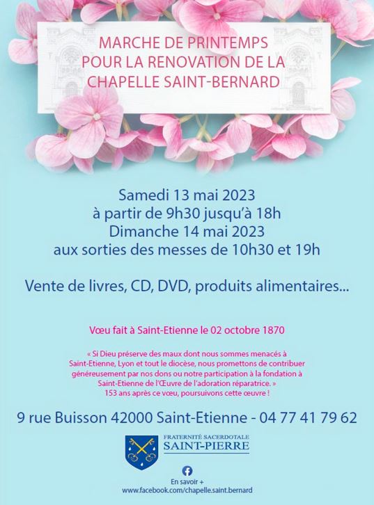 Pour financer les nombreux travaux de rénovation de la chapelle, elle propose un Marché de Printemps les 13 et 14 mai :
