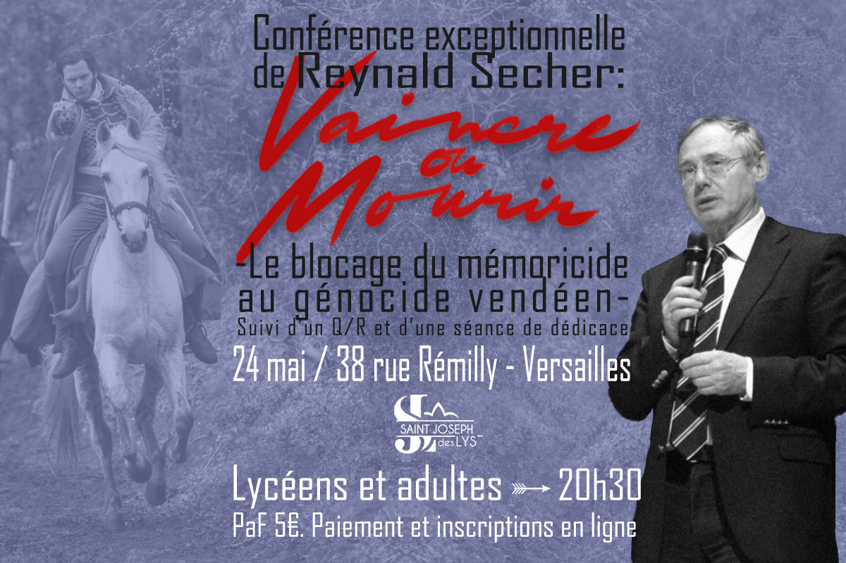 Reynald Secher donnera une conférence le mercredi 24 mai à 20h30 à Versailles (Saint-Joseph-des-Lys – 38 rue Rémilly – Versailles) :