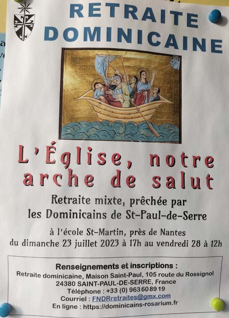 Accueil » Nos archives » Retraite dominicaine à la Placeliere (44) Summorum Pontificum Retraite dominicaine à la Placeliere (44) Du 23 au 28 juillet prochain les Dominicains de saint Paul de Serre en Dordogne prêcheront à l’école Saint Martin de la Placelière (FSSPX) près de Nantes une retraite mixte intitulée « l’Eglise, notre arche de salut« . Article précédentPour toute la Bourgogne, une ordination diaconale en vue du sacerdoce à Nevers Article suivantLa Bulle Quo Primum Tempore promulguée le 14 juillet 1570 14 juillet 2023