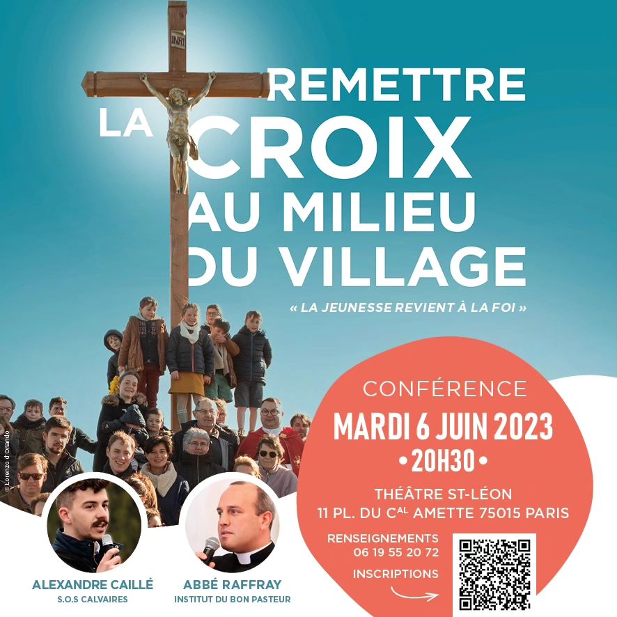 Accueil » Nos archives » Agenda : Conférence SOS Calvaire le mardi 6 juin à Paris Summorum Pontificum Agenda : Conférence SOS Calvaire le mardi 6 juin à Paris SOS Calvaires, avec l’abbé Mathieu Raffray IBP, propose une conférence « Remettre la croix au milieu du village » le mardi 6 juin à Paris (Paris XVè) : SOS Calvaires Article précédentDépart du Pèlerinage pour Chartres Article suivantÉtats-Unis: ordination de trois prêtres pour la Fraternité-Saint-Pierre 27 mai 2023