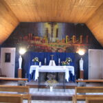 Les statues du Christ, de la Vierge et de ST Jean au dessus de l’autel sont en cerisier de notre jardin. Le chemin de croix a été peint à l’huile sur toiles. Les fresques au dessus de l’autel et des bas cotés, représentent l’usine, les cités ouvrières, un atelier de tréfilerie et la mine. Elles ont été peintes en acrylique ordinaire, sans préparation des murs ! Rien n’a bougé, ni terni, ni moisi, ni écaillé depuis 65 ans !