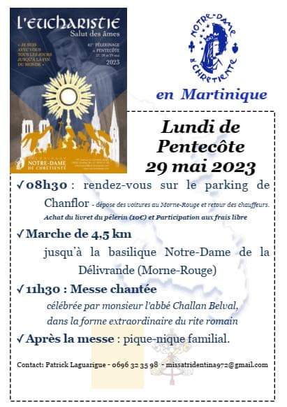 Nos amis martiniquais nous signalent un pèlerinage de lundi de Pentecôte jusqu’à la Basilique Notre-Dame de la Délivrande (Morne-Rouge). La messe sera célébrée par l’abbé Challan Belval, diocèse, en charge de la messe traditionnelle dans le diocèse [NDLR : La messe est célébrée les dimanches et fêtes à 9h30 à la Chapelle du Foyer de l’Espérance à Fort de France (semaine se renseigner)]