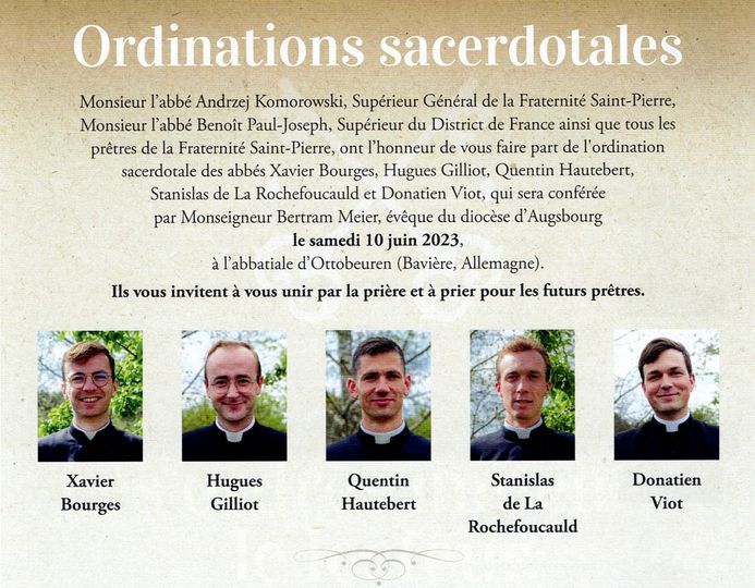 Accueil » Nos archives » 5 Français ordonnés prêtres pour la Fraternité Saint Pierre le 10 juin Summorum Pontificum 5 Français ordonnés prêtres pour la Fraternité Saint Pierre le 10 juin Le samedi 10 juin en l’abbatiale d’Ottobeuren, Mgr Meier, évêque d’Augsbourg, ordonnera 10 prêtres pour la Fraternité Saint-Pierre dont 5 Français. Fraternité Saint-Pierre (District de France) Article précédentRenaissance catholique s'intéresse à la crise dans l'Eglise Article suivantUne neuvaine pour la France 30 mai 2023