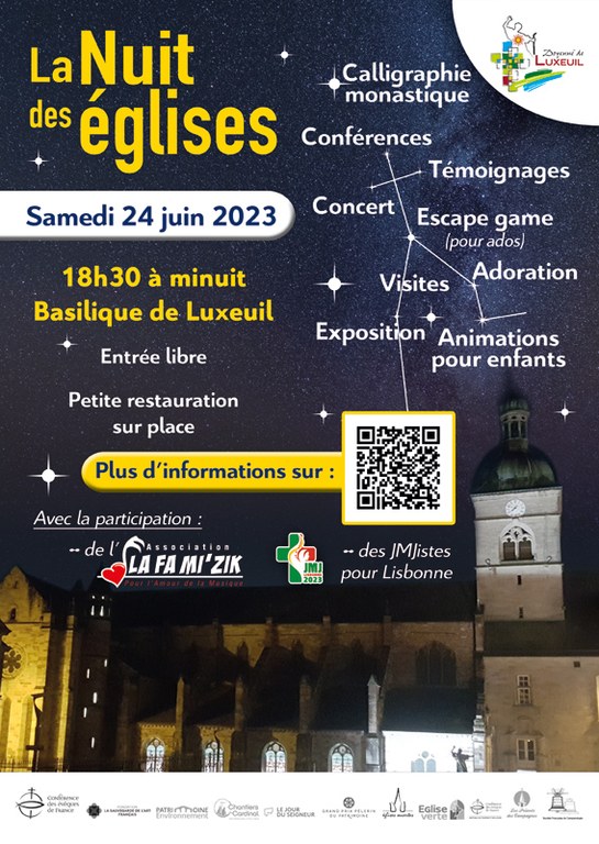 La soirée sera également musicale avec la participation du groupe local La Fa Mi’Zik qui assurera un concert pour chanter, bouger, prier. Des temps spirituels seront proposés avec une temps d’adoration en fin de soirée, le témoignage de la vocation baptismale du P. Christophe Bazin, l’histoire de pèlerins… Cette année, ce sont en effet les grands itinéraires de pèlerinage qui sont mis à l’honneur par la Nuit des Églises, événement national qui aura lieu pour la première fois à Luxeuil« .