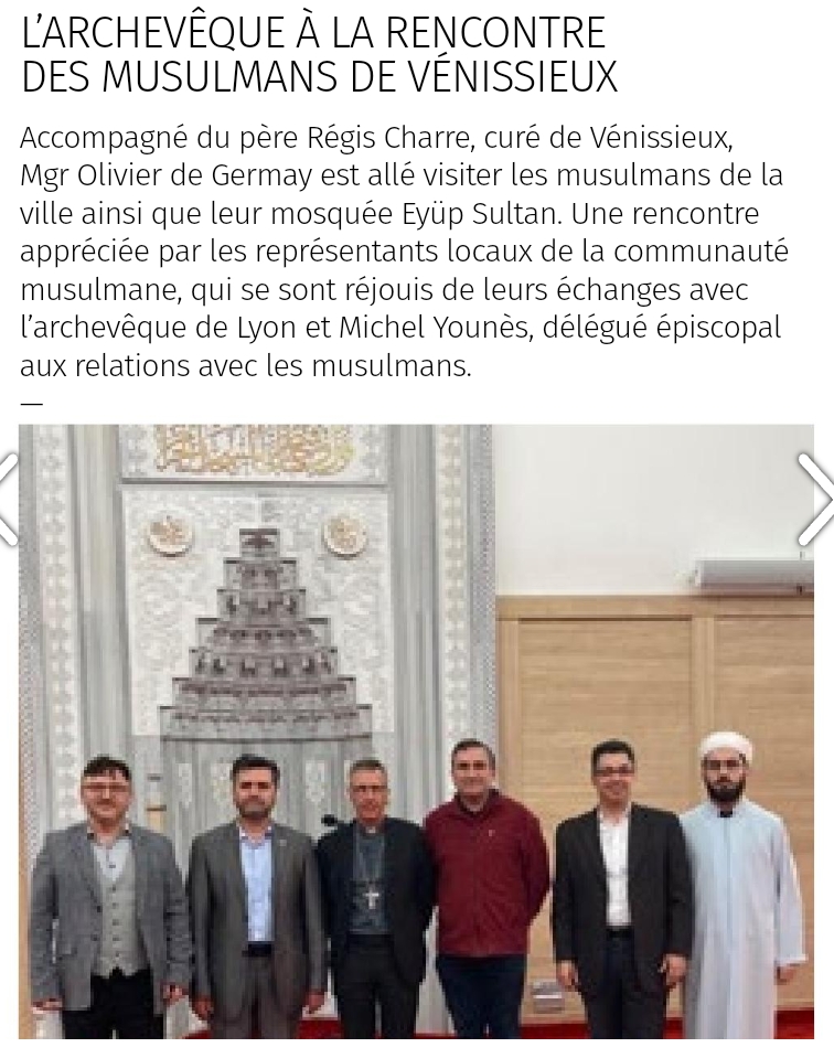 On le savait proche des imams locaux. Le tour des mosquées continue, avec Vénissieux, d’après le mensuel diocésain de juin – néanmoins la presse locale ne semble pas avoir rendu compte de cette visite, où il était accompagné du curé de Vénissieux Régis Charre et du délégué diocésain aux relations avec les musulmans, Michel Younès.