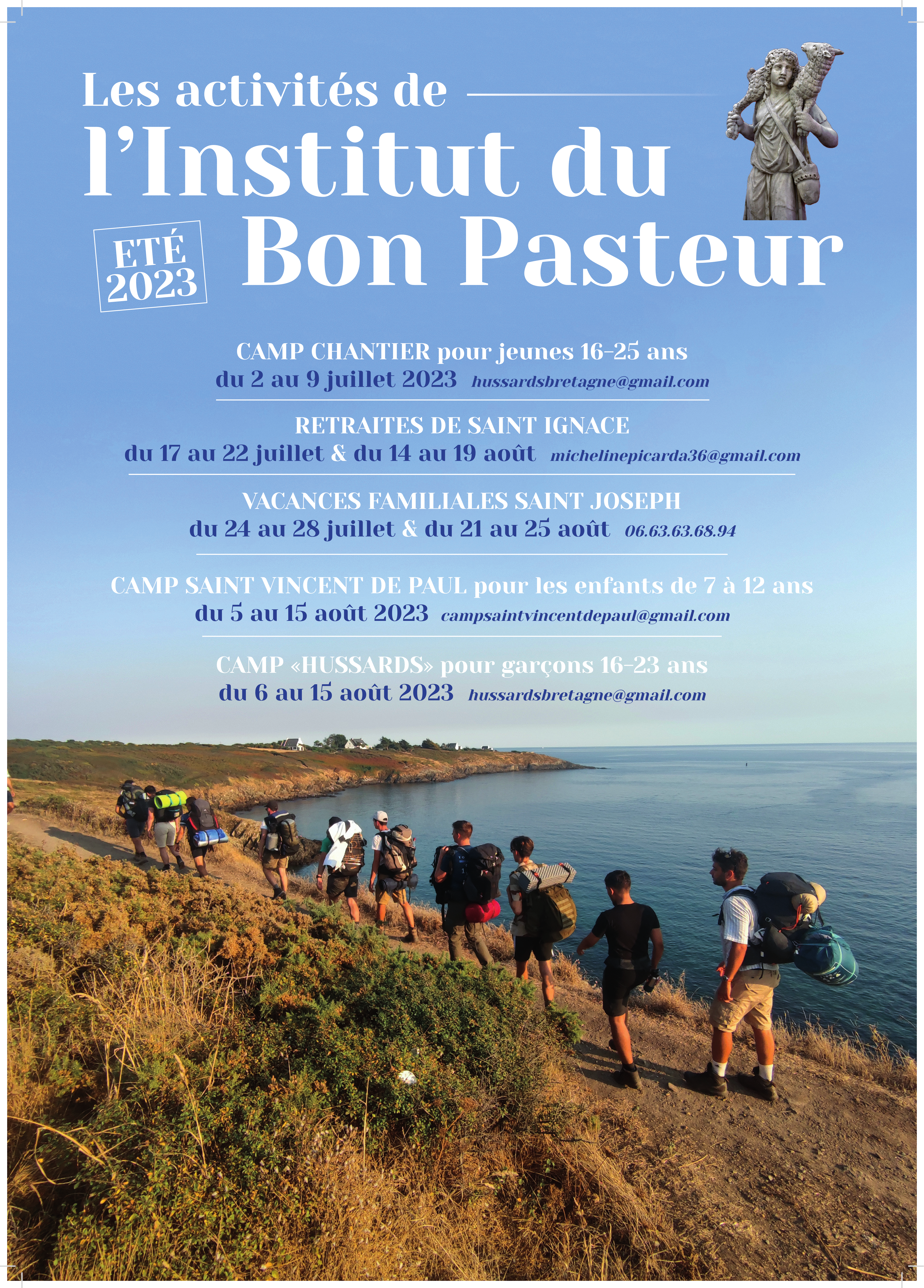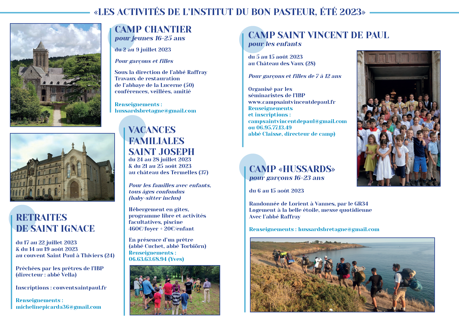 Accueil » Nos archives » Activités d’été avec l’Institut du Bon Pasteur Summorum Pontificum Activités d’été avec l’Institut du Bon Pasteur L’Institut du Bon Pasteur propose différentes activités pour l’été : camp-chantier, route, camp pour enfants ou encore retraites spirituelles : Institut du Bon Pasteur (IBP) Article précédentCamp d'été du Chapitre Sainte-Madeleine dans le Tyrol (Août 2023) Article suivantDiocèse de Saint-Claude (Jura) : plus de prêtres et encore moins de laïcs 17 juin 2023