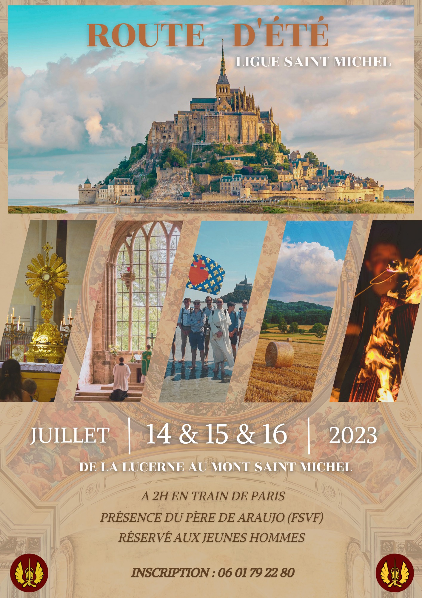Accueil » Nos archives » Route d’été avec la Ligue Saint-Michel les 14, 15 et 16 juillet Summorum Pontificum Route d’été avec la Ligue Saint-Michel les 14, 15 et 16 juillet Un lecteur nous invite à diffuser cette annonce : Renseignements (Facebook) Article précédentChartres 2023 : remerciements de Jean de Tauriers Article suivant«L'Église catholique» se verra remplacée par une «Église synodale» 20 juin 2023