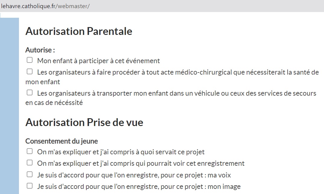 Et dans le diocèse du Havre, même l’orthographe du site – en l’occurrence un formulaire à faire remplir par les parents de fidèles mineurs qui participent aux événements diocésains – s’est effondrée…