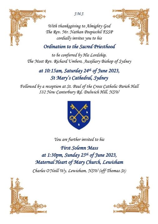 Ce samedi 24 juin, Mgr Richard Umbers, évêque auxiliaire de Sydney (Australie) ordonnera prêtre l’abbé Nathan Pospischil, FSSP en la cathédrale Sainte-Marie de Sydney (Australie).