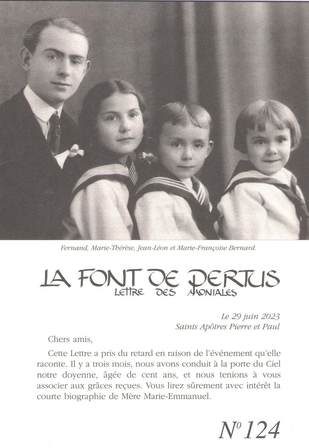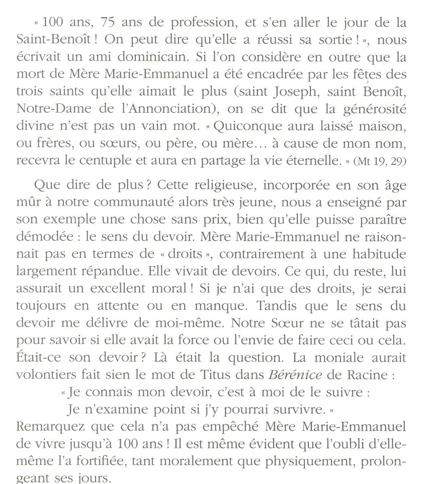 La lettre des Moniales La Font de Pertus (n°124, 29 juin 2023), lettre des bénédictines du Barroux, revient sur le rappel à Dieu de la doyenne des moniales Mère Marie-Emmanuel rappelée à Dieu à 100 ans en mai 2023. Mère Marie-Emmanuel est entrée au Barroux en 1994 après près de 50 ans de vie religieuse à l’abbaye de La Paix Notre-Dame (Sarthe).