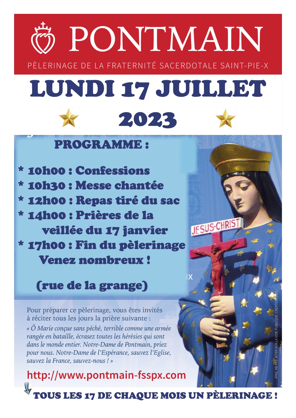 La Fraternité Sacerdotale Saint Pie X vous propose tous les 17 de chaque mois, la messe à 10h30 suivi du repas. Puis de 14h jusqu’à 17h, le parcours jubilaire à l’aide des prières de la veillée du 17 janvier 1871.