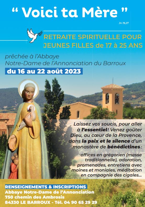 Comme chaque année en fin d’été, une retraite spirituelle pour jeunes filles de 17 à 25 ans est prêchée à l’Abbaye Notre-Dame de l’Annonciation du Barroux du 16 au 22 août 2023 : Conférences, offices en grégorien (forme extraordinaire), promenades, entretiens avec moines et moniales…