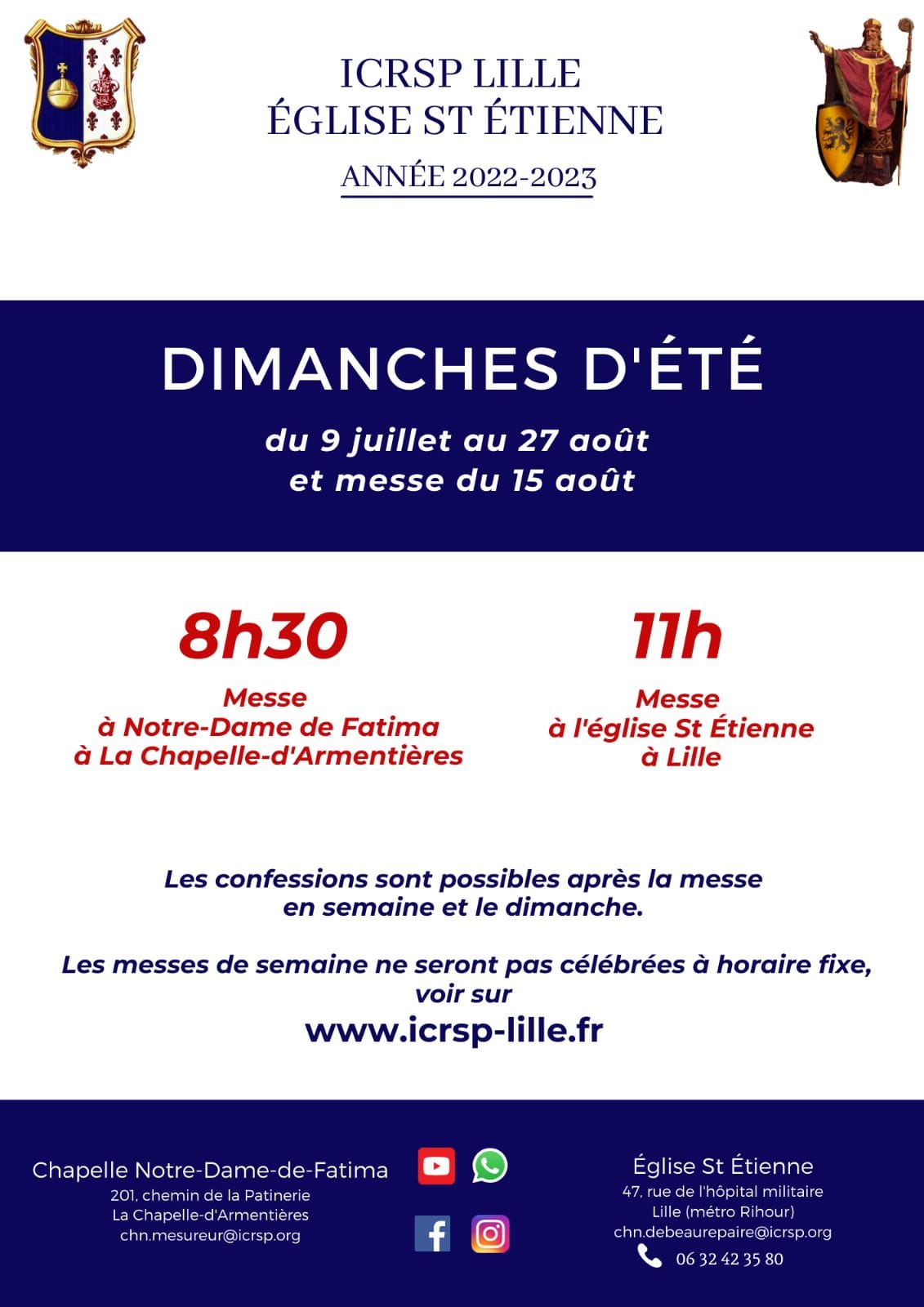 Accueil » Nos archives » Brève: Horaires d’été pour les messes traditionnelles à Lille Summorum Pontificum Brève: Horaires d’été pour les messes traditionnelles à Lille Un lecteur nous indique que les horaires des messes traditionnelles célébrées à Lille et la Chapelle d’Armentières sont modifiés pour l’été : ICRSP Lille Article précédentLe Cours Saint-Martial (Limoges) ouvre un collège et va déménager Article suivantPithiviers (45) : des aménagements liturgiques à l'image de la pastorale. En carton. 28 juillet 2023