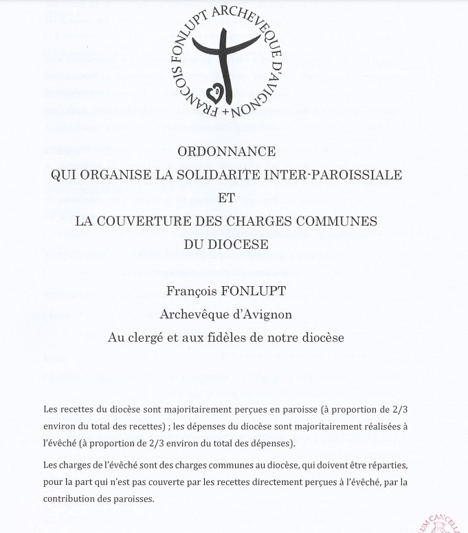 Mgr Fonlupt, archevêque d’Avignon, a promulgué une longue ordonnance pour réformer les finances du diocèse d’Avignon et créer une péréquation inter-paroissiale.