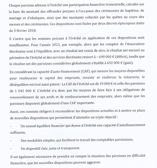 Plutôt que d’économiser à l’évêché, il convient d’augmenter les versements des paroisses – à 55% des revenus qu’elles perçoivent des « offrandes de casuel, baptêmes, mariages et funérailles, quêtes, cierges et revenus locatifs », ces deux derniers postes après un abattement de 50%. Quant aux quêtes lors des funérailles, elles restent aux paroisses – Monseigneur ne veut pas la guerre…