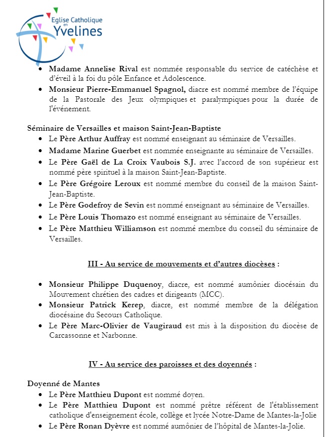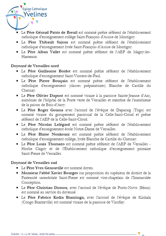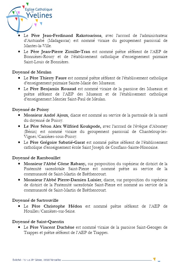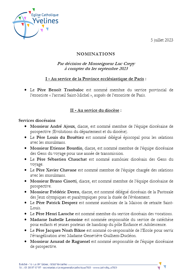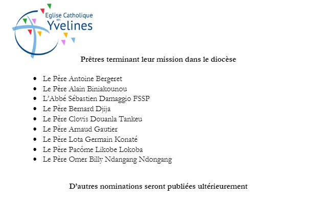 Accueil » Nos archives » Versailles : suite des nominations diocésaines Non classifié(e) Versailles : suite des nominations diocésaines A la suite des nominations diocésaines parues en avril et juin dernier, d’autres sont parues, effectives en septembre : Un certain nombre de prêtres achèvent aussi leur mission. Article précédentMende : les nominations diocésaines Article suivant20è Pèlerinage Marie Reine du Canada les 2, 3 et 4 septembre 25 août 2023