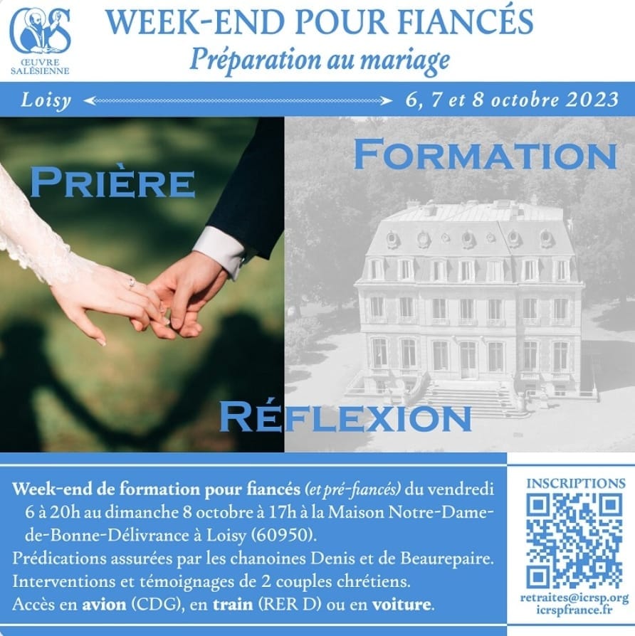 La Province de France de l’Institut du Christ Roi propose aux fiancés 2 jours sous le regard de Dieu avec l’enseignement de deux prêtres et le témoignage de deux couples : Prière, conférences, entretiens individuels… Ce week-end complète les rendez-vous réguliers requis pour une bonne préparation au mariage.