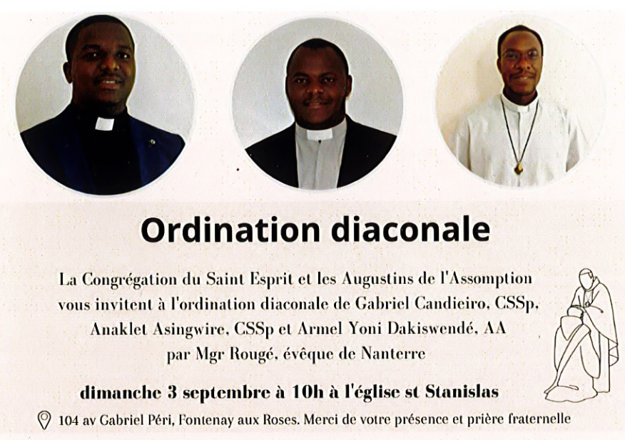 Dimanche dernier, trois diacres ont été ordonnés en vue du sacerdoce par Mgr Matthieu Rougé à l’église Saint-Stanislas des Blagis (commune de Fontenay-aux-Roses). Un assomptioniste et deux spiritains ont ainsi reçu l’ordination diaconale des mains de l’évêque de Nanterre.