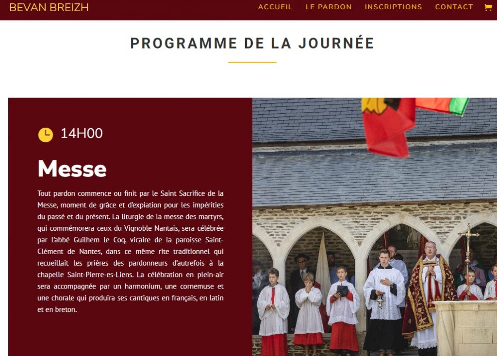 Le pardon, oublié depuis la Révolution française et la Terreur de 1793, débutera par une messe car, comme le précise Bevañ Breizh, « tout pardon commence ou finit par le Saint Sacrifice de la Messe, moment de grâce et d’expiation pour les impérities du passé et du présent ». Par ailleurs, la célébration, qui aura lieu en plein air, sera accompagnée par un harmonium, une cornemuse et une chorale qui produira ses cantiques en français, en latin et en breton« . La messe sera suivie d’une procession, de l’inauguration d’un calvaire en mémoire des victimes de 1793, d’un dîner et d’un fest-noz.
