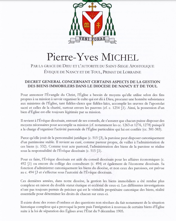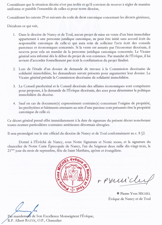On note le paragraphe 1 : « dans le diocèse de Nancy et Toul, aucun projet de mise en vente d’un bien immobilier appartenant à une personne juridique canonique ne peut être initié sans accord écrit du responsable canonique de celle-ci qui aura soin de solliciter l’avis écrit des conseils pastoraux et économiques concernés. Si la vente est effectuée par l’économe diocésain, il recevra pour cela un mandat écrit de la personne juridique canonique concernée. Le vicaire général sera informé dès le début du projet de son existence. Par mandat de l’Evêque, il lui convient d’accorder formellement par écrit la confirmation du projet finalisé« .
