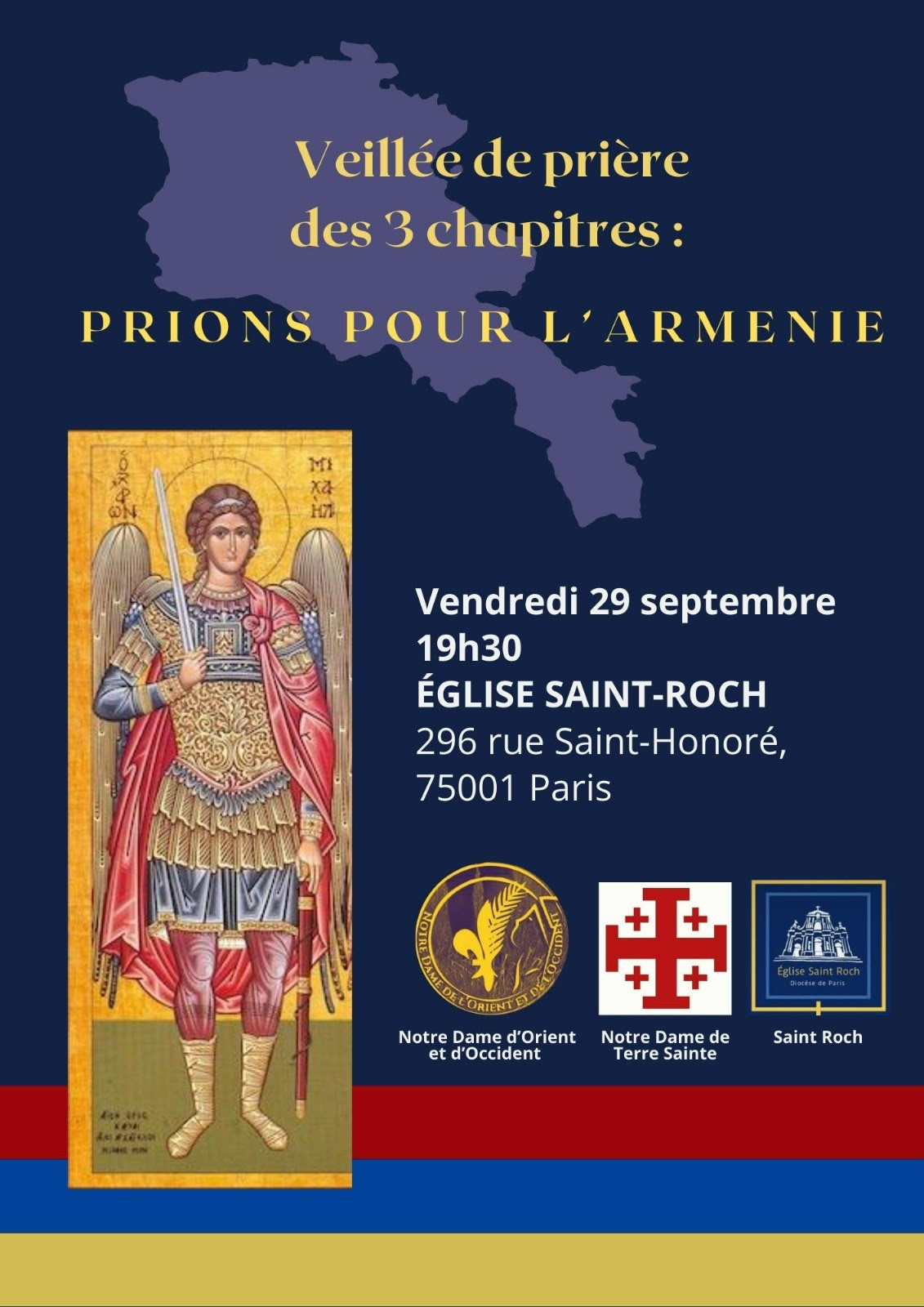 Accueil » Nos archives » Veillée de prière pour l’Arménie ce vendredi 29 septembre à l’église Saint-Roch (Paris) Informations Veillée de prière pour l’Arménie ce vendredi 29 septembre à l’église Saint-Roch (Paris) Notre-Dame de Chrétienté indique qu’une veillée de prière pour l’Arménie est organisée à l’église Saint-Roch (Paris 1er) ce vendredi 29 septembre 2023 : Article précédentRentrée à Wigratzbad (suite) Article suivantBénédiction du nouveau prieuré de la FSSPX à Reims 29 septembre 2023