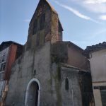 Il s’agit de l’église Saint-Jean, construite au XIIe siècle de l’autre côté du Dadou, rivière le long de laquelle s’établissent de nombreuses usines de tannage, des mégisseries, des cordonneries… Ce centre industriel isolé (coupé du rail depuis 1937 et encore aujourd’hui relié à Albi, Castres et surtout Toulouse par quelques rares bus) qui travaille essentiellement en lien avec Mazamet voit en 1966 ses 106 entreprises du cuir employer encore 2600 ouvriers, et attire la main d’oeuvre immigrée. Celle-ci est restée, tandis qu’à de rares exceptions près, les usines et anciens séchoirs à peaux qui émaillent le tissu urbain ont fermé – la ville a compté jusqu’à 160 friches industrielles, en sus de nombreux immeubles dégradés, voire tenus par des étais…