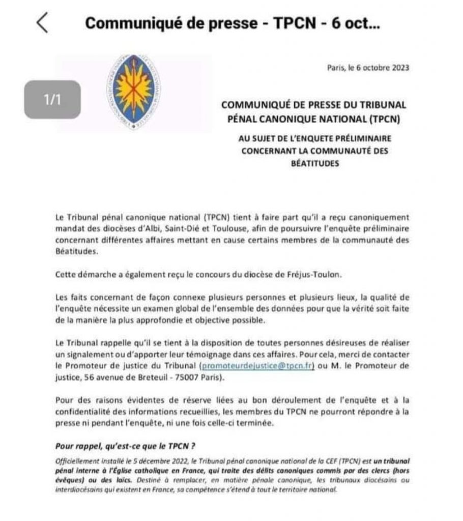 Les diocèses d’Albi, Saint-Dié et Toulouse ont donné mandat au tribunal pénal canonique national pour qu’il poursuive l’enquête canonique préliminaire concernant diverses affaires liées à la communauté des Béatitudes.