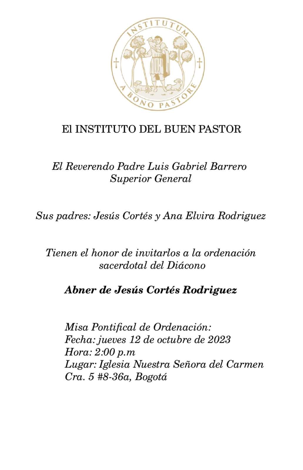 L’Institut du Bon Pasteur annonce l’ordination sacerdotale le jeudi 12 octobre à Bogota (Colombie) de l’abbé Abner de Jésus Cortes Rodriguez, IBP. Il s’agit du 8è prêtres ordonnés pour l’Institut du Bon Pasteur cette année.
