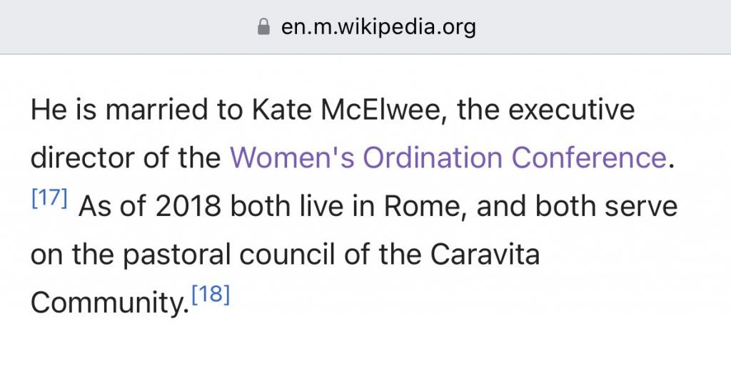 En effet, la Women’s Ordination Conference est présidée par Kate McElwee qui, selon cette fiche Wikipédia, est la femme de de joshua J. McElwee; il est même précisé que tous deux vivent à Rome: