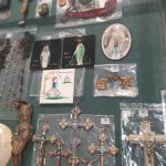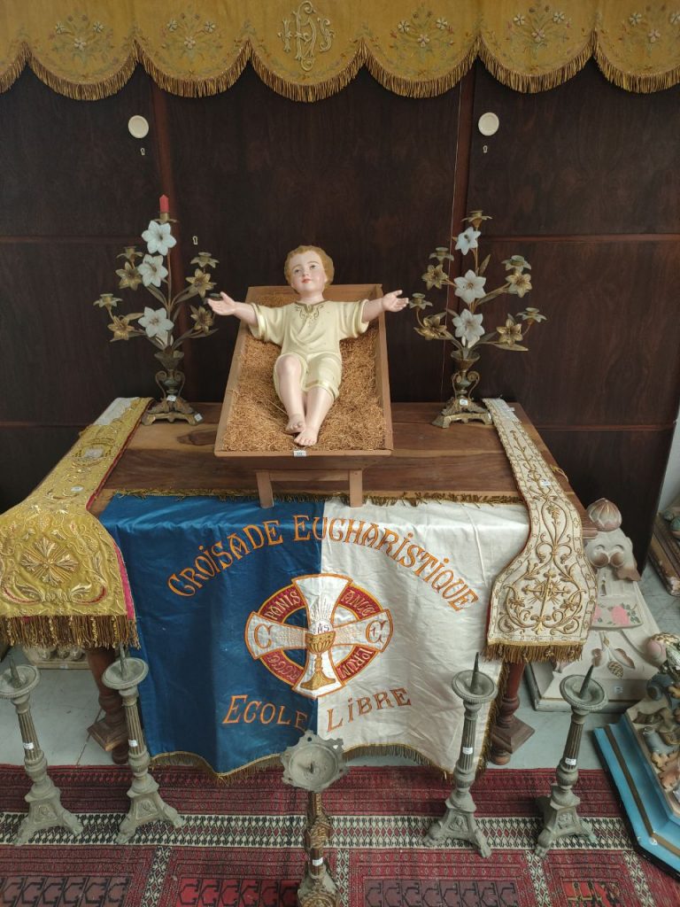 Parmi les curiosités et autres statues, il y a une statue de saint Crépin ou Crespin, saint patron des cordonniers (lot 358), un sacré coeur de Jésus dans un cadre (lot 364), ou encore une bannière de la croisade eucharistique (lot 373), une représentation de Saint-Martial en émail de Limoges (lot 434) ou encore un chasublier (lot 457)… et un chemin de croix monumental, peint sur cuivre, d’origine flamande (lot 280).
