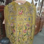Du côté de la paramentique, il y a entre autres un ornement blanc à fleurs fin XVIIIe (lot 190), un ornement d’or à fleurs XVIIIe mis à prix 3000 € (lot 195), un ornement noir or (lot 202), plusieurs soutanes (lots 210 et 258), une barrette (lot 208), une garniture de catafalque (lot 212), des surplis en dentelle (lots 199, 204…), des aubes, un ornement à trois chevaux rouge (lot 252),, des boucles de chape (lots 78, 362) etc.
