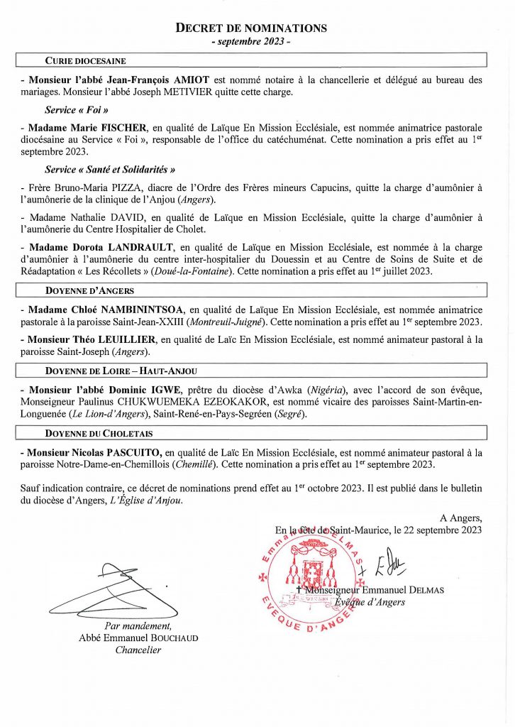 Accueil » Nos archives » Angers : les nominations diocésaines de la rentrée Informations Angers : les nominations diocésaines de la rentrée Voici les nominations diocésaines de la rentrée, dans le diocèse d’Angers : Article précédentLe Christ-Roi, seule voie de la Paix Article suivantClôture du Pèlerinage Ad Petri Sedem 29 octobre 2023